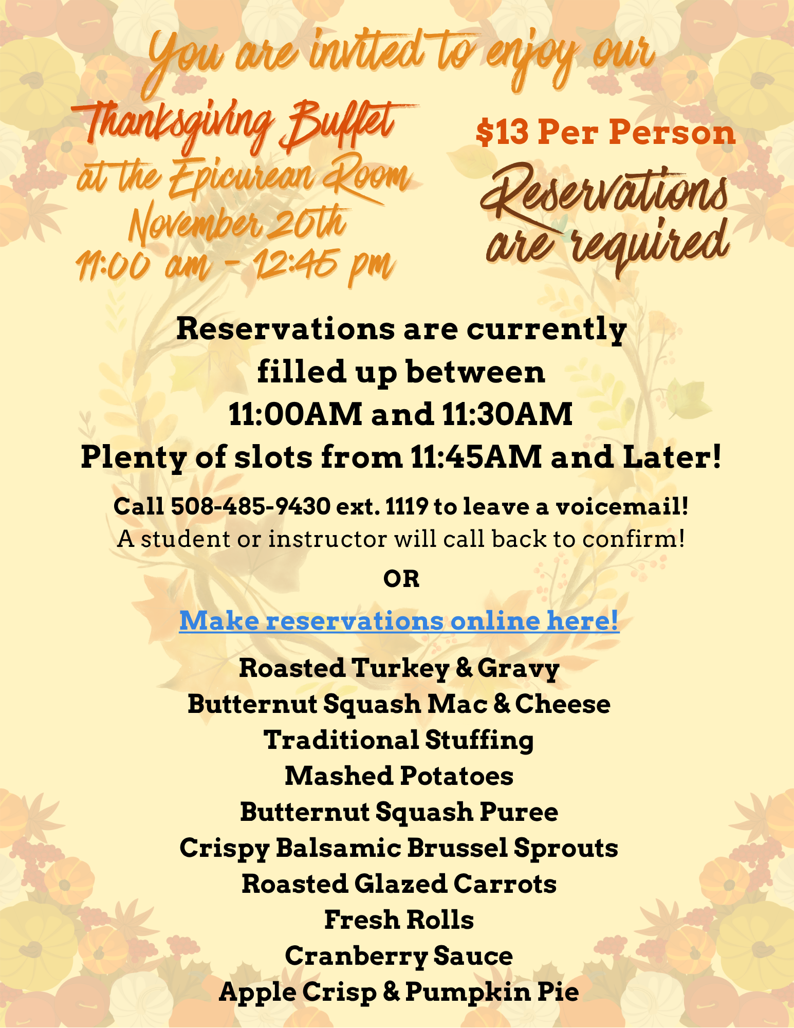 Please join us in the Epi on November 20th for our Thanksgiving Buffet. Reservations are required and tables can be reserved from 11:00AM-12:30PM. We hope you can join us for this wonderful event!