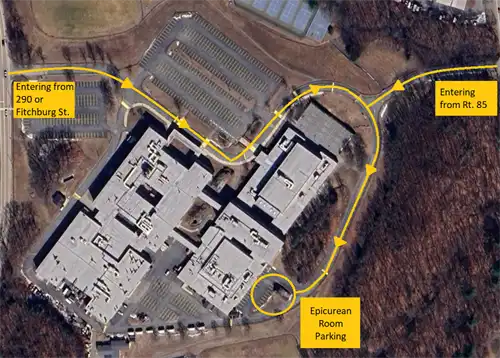 When you enter the school parking lot, follow the road to the left all the way around to the backside of the building. You will see the Epicurean Restaurant Parking Lot.